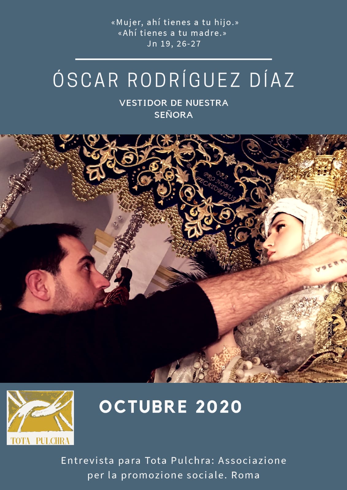 Tota Pulchra en su Delegación en España realizará una entrevista el próximo mes de Octubre del presente año a Don Óscar Rodríguez Díaz, Vestidor de Nuestra Señora la Virgen Maria, donde nos hablara de su vocación a vestir a la Madre de Dios como buen hijo suyo, su sentir en este gran honor, su mirada de hijo a tan querida Madre, y sus diálogos con Ella en esta hermosa tarea.