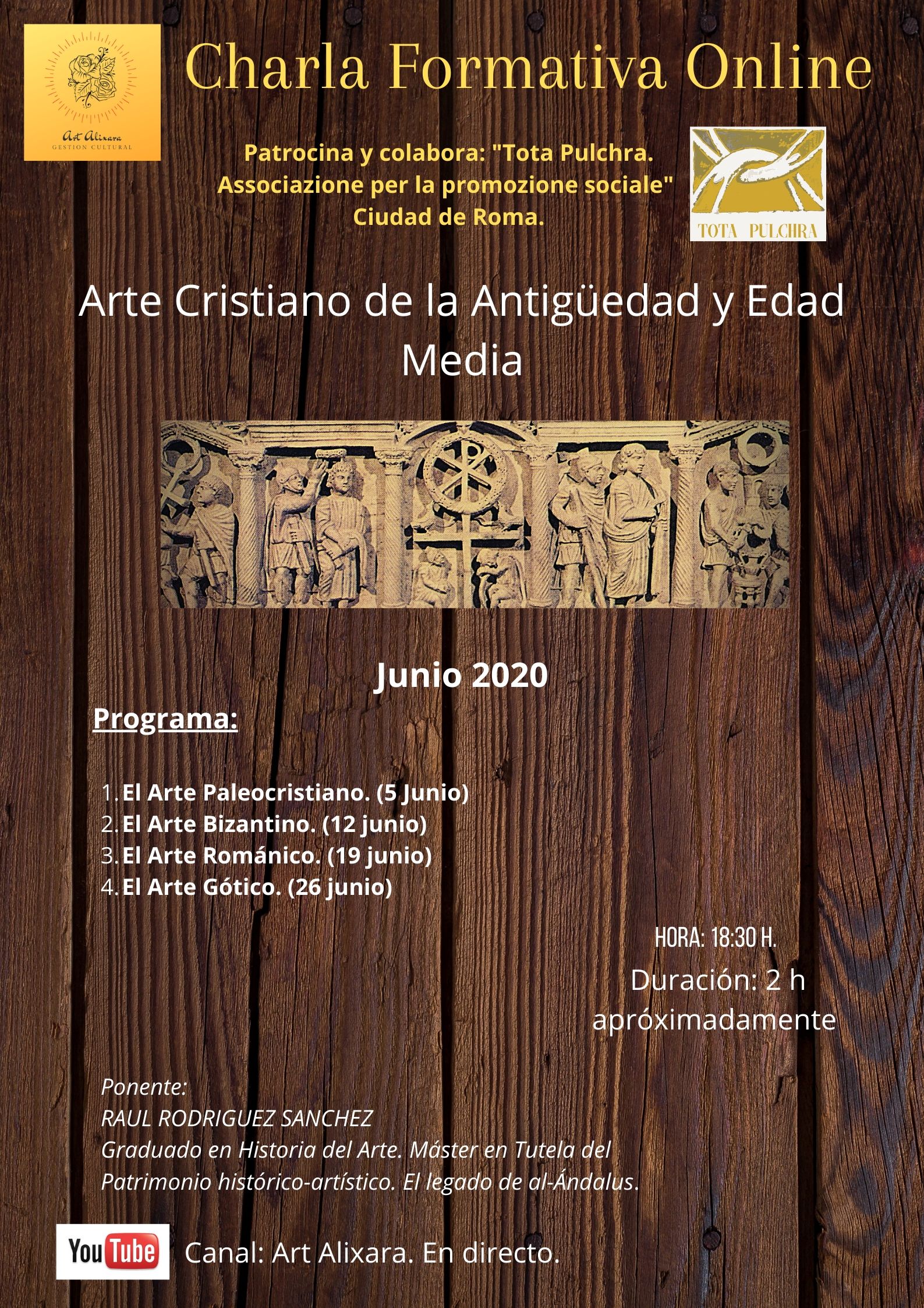 Debido al gran interés de numerosas personas por el arte, la historia y la cultura que nos han hecho ser lo que hoy somos, se propone desde “Art Alixara Gestión Cultural” un conjunto de charlas formativas vía online que en esta ocasión versarán sobre el “Arte Cristiano de la Antigüedad y Edad Media” divididas en cuatro secciones de dos horas de duración máximo a través del Canal de Youtube “Art Alixara” en directo.