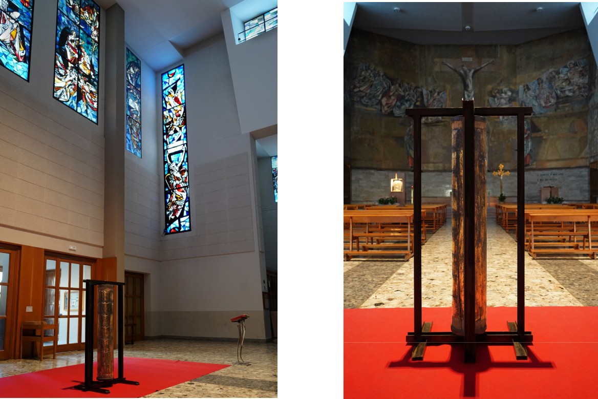Frase scritta dall'artista e che ci introduce al perché in quest'opera Antonio Teruzzi utilizza il legno. Nella cultura occidentale il legno ha un significato rilevante: legno della croce, materiale che unisce due momenti della storia dell'umanità e indica i due misteri di morte e resurrezione.