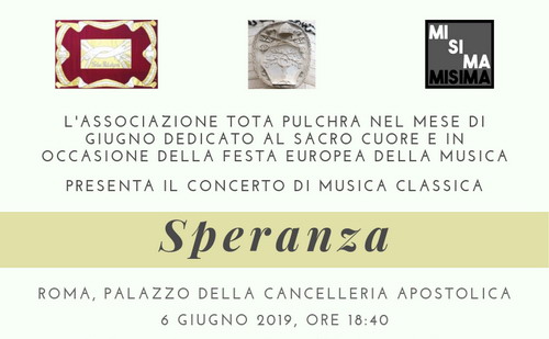 Giovedì 06-06-2019, dalle ore 18:40, presso la splendida cornice del Palazzo della Cancelleria Apostolica in Piazza della Cancelleria 1, si terrà il concerto di beneficenza "Speranza", importante appuntamento con la solidarietà il cui ricavato sarà interamente devoluto allo sviluppo di programmi sociali e culturali in favore degli artisti che, in una società attanagliata dalla crisi, fanno fatica ad affermare il loro indiscusso genio creativo. Il concerto, che cade proprio nel mese di giugno dedicato al Sacro Cuore di Gesù, è organizzato dall’associazione culturale Misima, in collaborazione con l’associazione di promozione sociale delle Arti Tota Pulchra diretta dal Presidente Mons. Jean Marie Gervais.