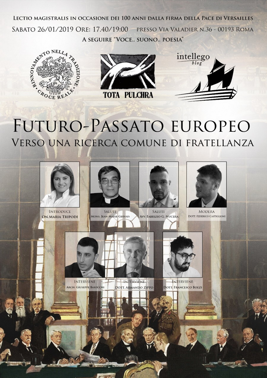 Sabato 26 gennaio 2019, presso il salone del Teatro del Pepe in via Valadier 36, due eventi hanno fatto da capolino a un pomeriggio ricco di emozioni. Dalle 17:40 alle 19:00 gli ospiti hanno assistito a una interessante Lectio Magistralis in occasione dei 100 anni dalla firma della Pace di Versailles e dal titolo: “Futuro-Passato Europeo. Verso una ricerca comune di fratellanza”. Ad introdurre i lavori è stata l’On. Maria Tripodi dopo i saluti del Presidente Jean Marie Gervais e dell’Avv. Fabrizio Nucera. Ad intervenire sono stati: l’Architetto Giuseppe Baiocchi, il Dott. Armando Zippo e il Dott. Francesco Boezi. A moderare il convegno è stato il Dott. Federico Castiglioni.