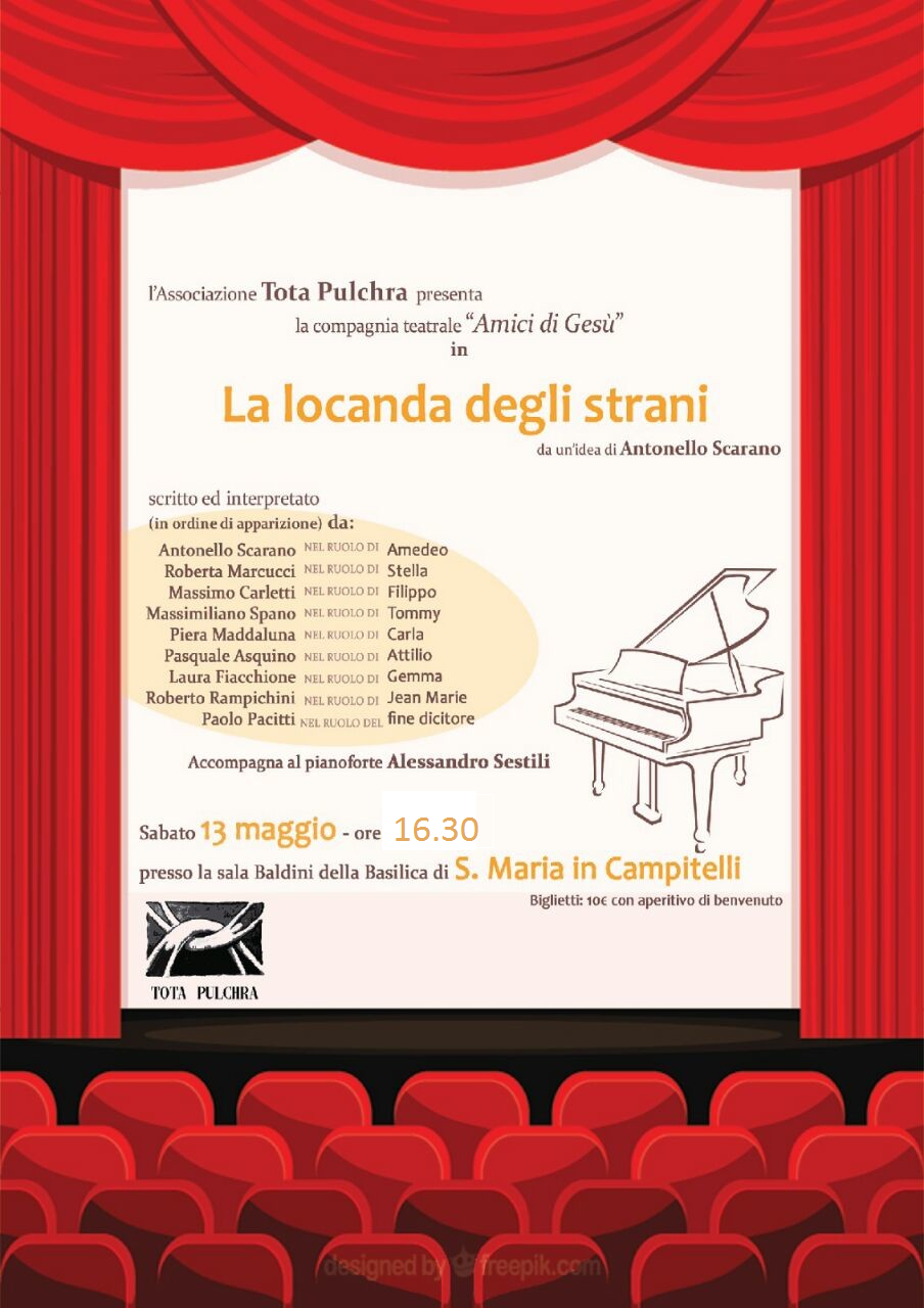La Compagnia teatrale 'Amici di Gesù' sabato 13 maggio alle ore 16,30 presso la Sala Baldini della Basilica di Santa Maria in Campitelli porterà in scena "La locanda degli strani" da un'idea di Antonello Scarano. Presentata dall'associazione culturale "Tota Pulchra", l'opera - che sta a metà strada tra il dramma e la commedia - vede alternarsi sul palcoscenico le storie di otto personaggi irrisolti alla ricerca di una propria identità.